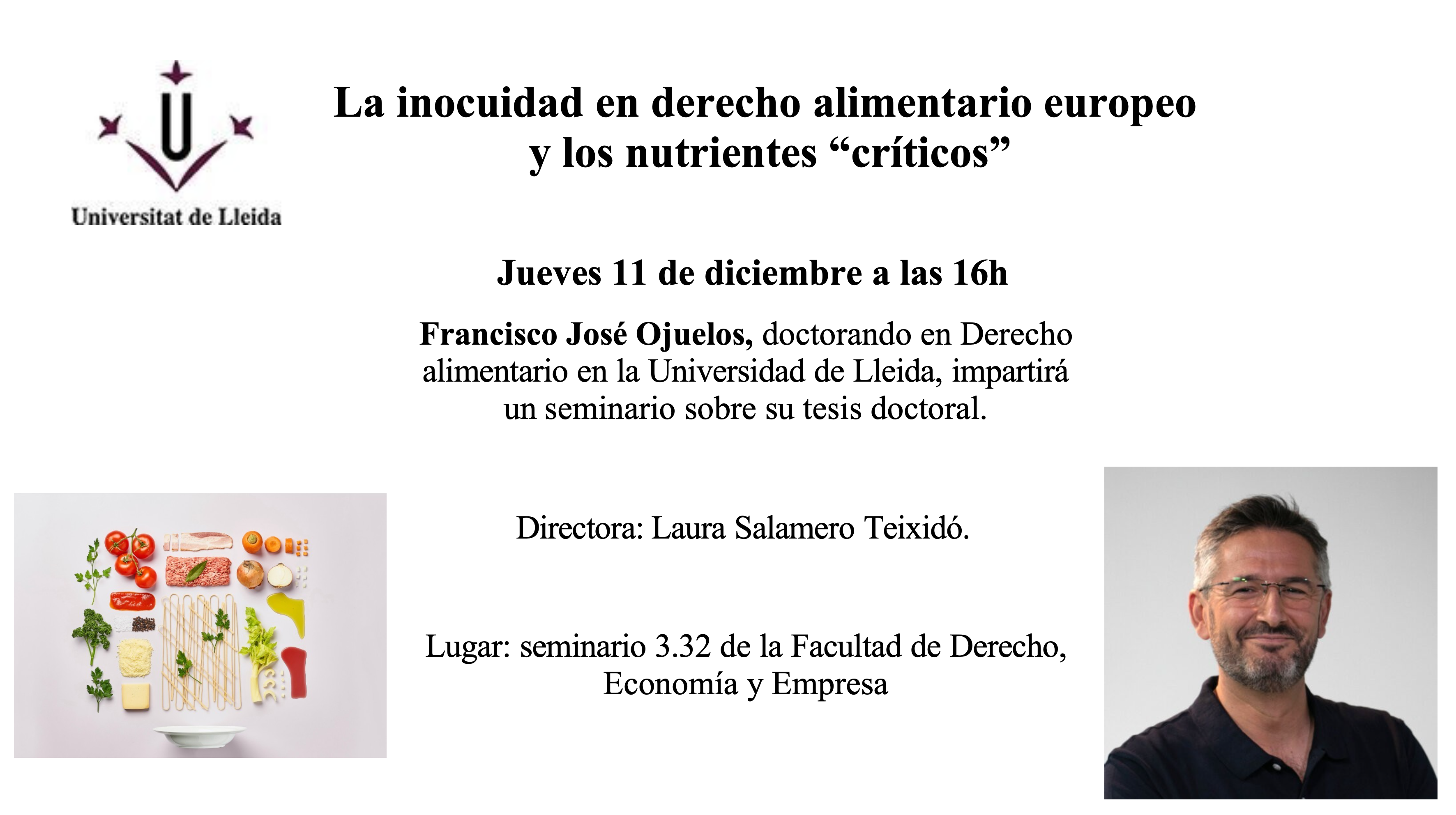 Descargar pdfLa Facultad de Derecho, Economía y Empresa acogerá el próximo 11 de diciembre a las 16 h el seminario “La inocuidad en el derecho alimentario europeo y los nutrientes ‘críticos’”, a cargo de Francisco José Ojuelos, doctorando en Derecho alimentario en la Universidad de Lleida.